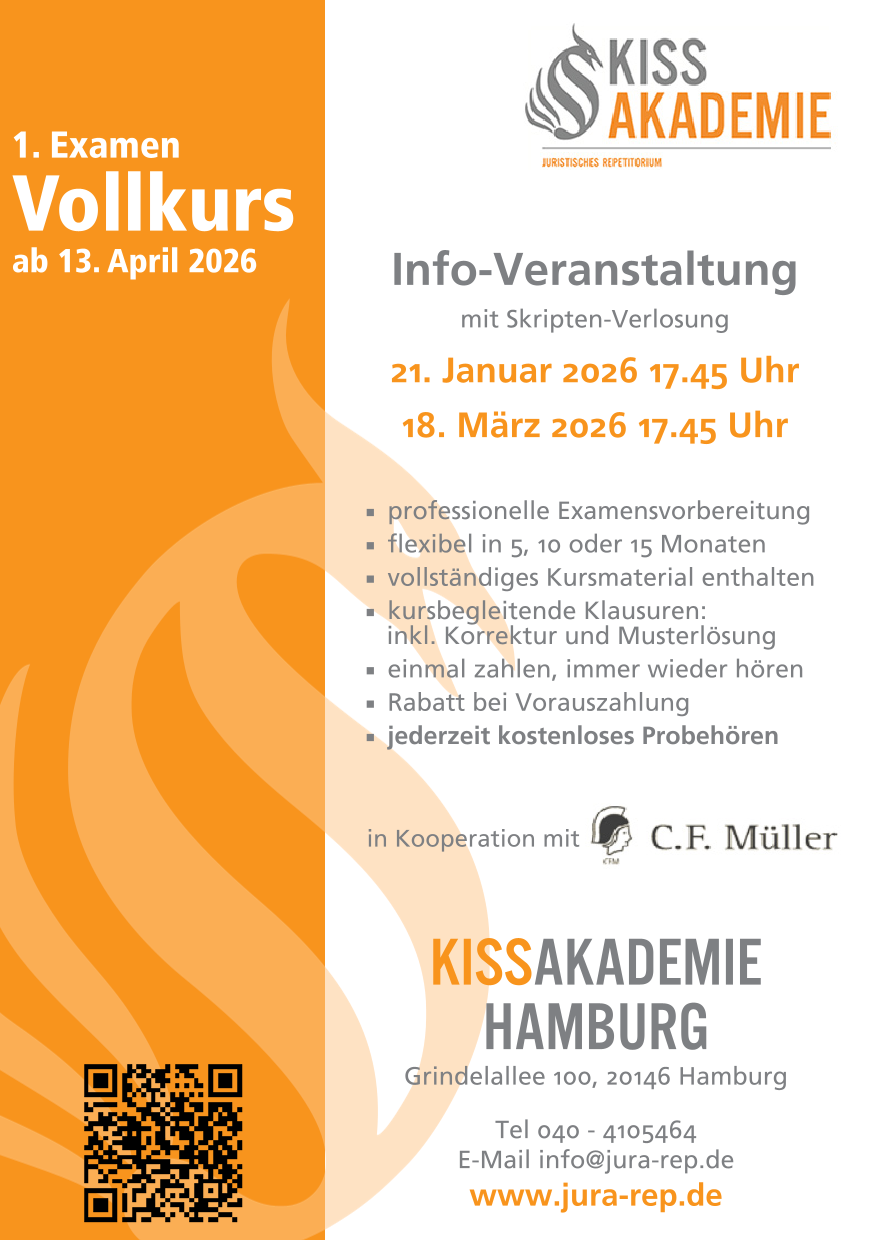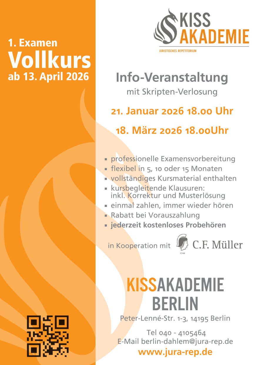 Die KissAkademie - Rechtsprechungsübersicht wendet sich als Monatszeitschrift an Studenten und Referendare, die im Dschungel der Ausbildungsliteratur - neben den abstrakten Lernstoffen – den Blick für die aktuellen Fragen und Probleme in der Prüfungsvorbereitung nicht verlieren wollen.